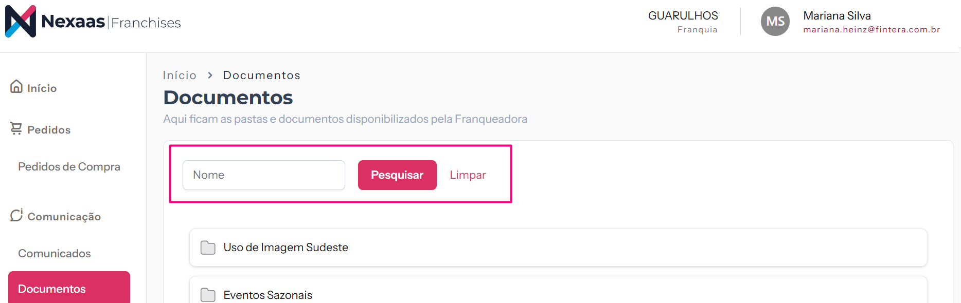 Comece acessando o Nexaas Franchises, realizando login com o Nexaas ID. Após, no menu principal lateral, na seção Comunicação, clique na opção Documentos.