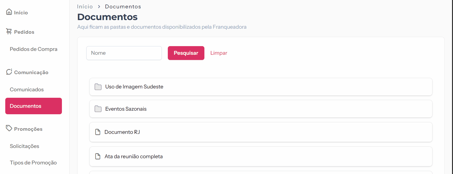 A tela Documentos foi desenvolvida para apoiar as franquias na organização dos materiais compartilhados pela franqueadora. Nela, todos os arquivos importantes ficam reunidos em um só lugar, garantindo acesso rápido, seguro e centralizado.