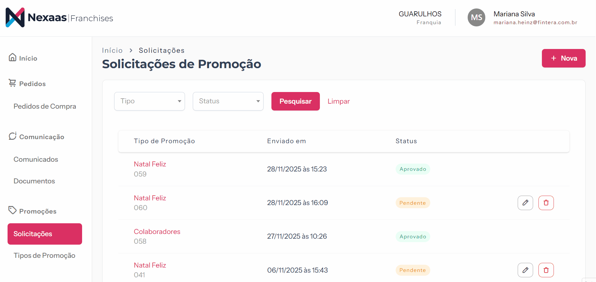 Enquanto estiver pendente, é possível editar ou excluir a solicitação, utilizando os ícones disponíveis ao final da linha correspondente. Isso permite ajustes rápidos antes do envio para análise da franqueadora: