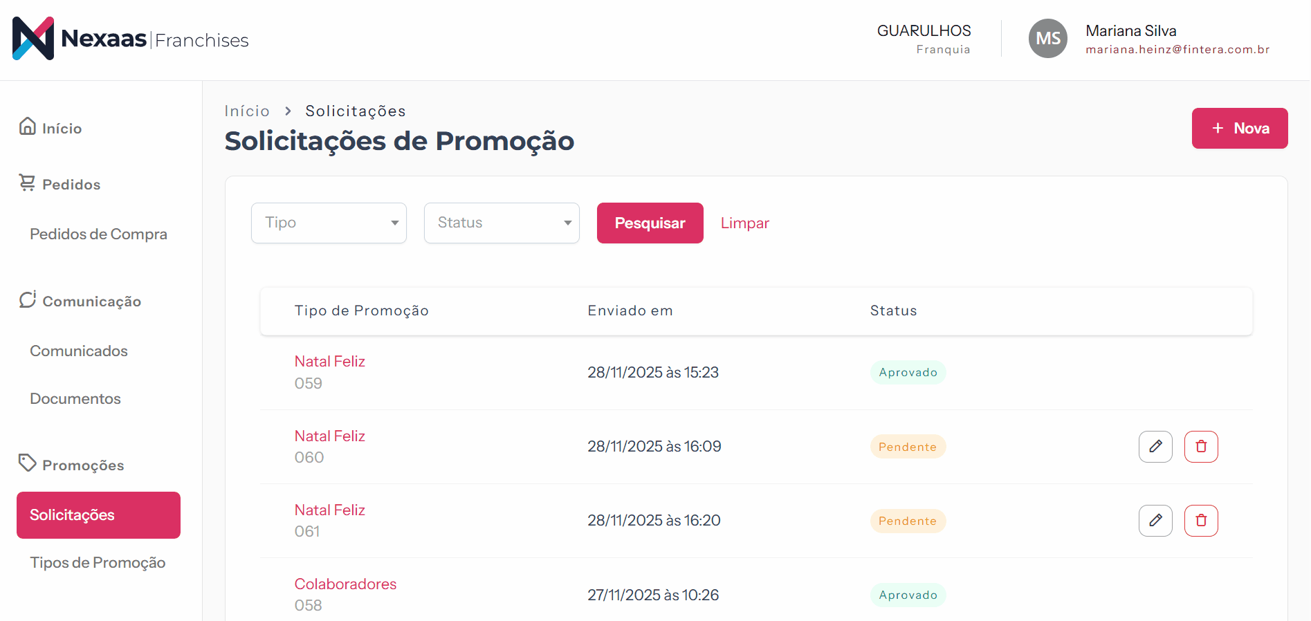 Para cadastrar uma nova solicitação de promoção para a franqueadora, clique no botão + Nova, no topo superior direito da tela.