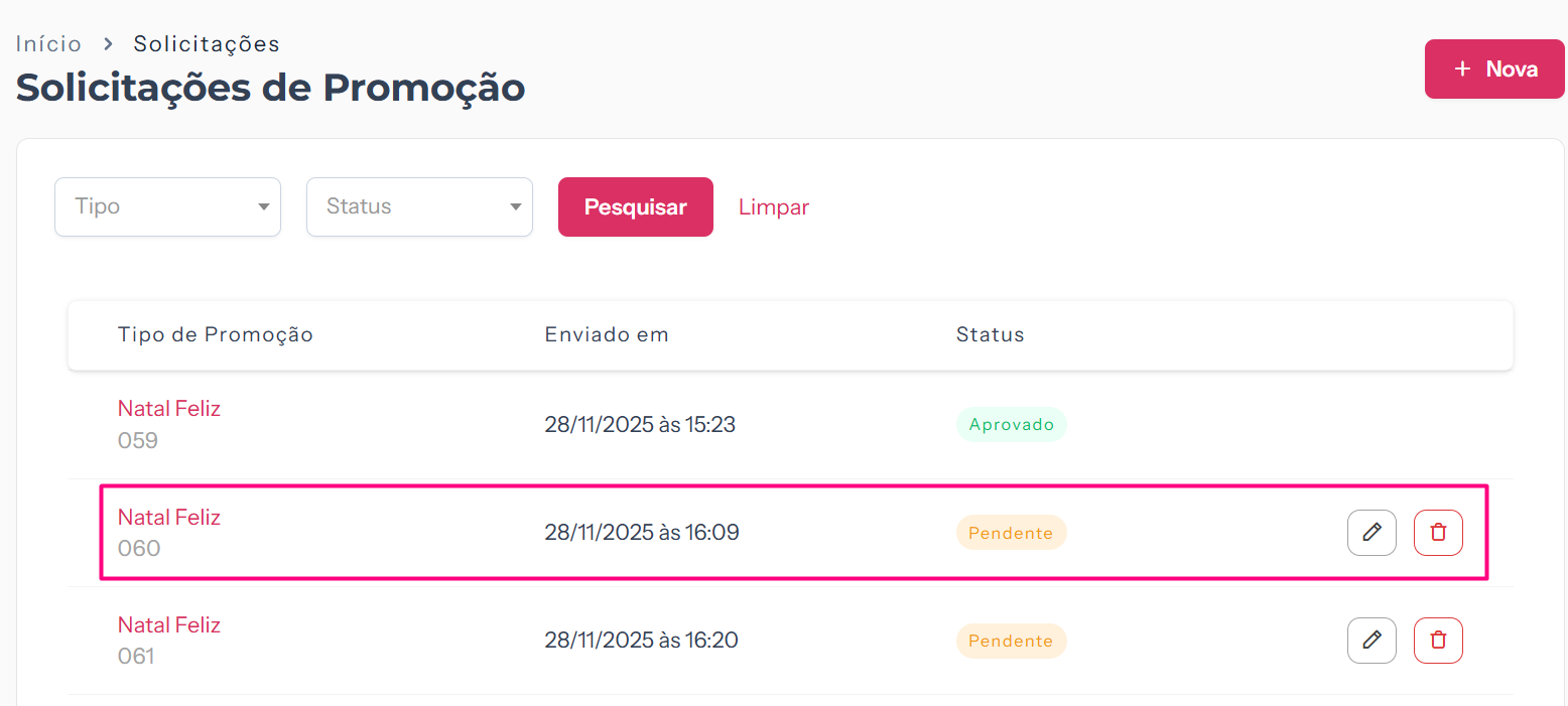 Após clicar em Criar Solicitação, você será direcionado automaticamente para a tela de Solicitações, onde poderá visualizar sua nova promoção com o status Pendente.
