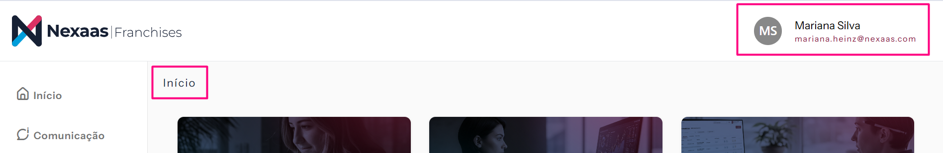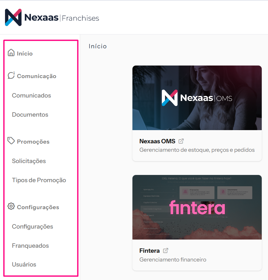 ⚠️ Importante: o Nexaas Franchises exibe os menus laterais e telas com base no seu perfil de acesso (se Franquia ou Franqueadora). Dessa forma, você visualiza apenas o que é essencial para suas atividades diárias.