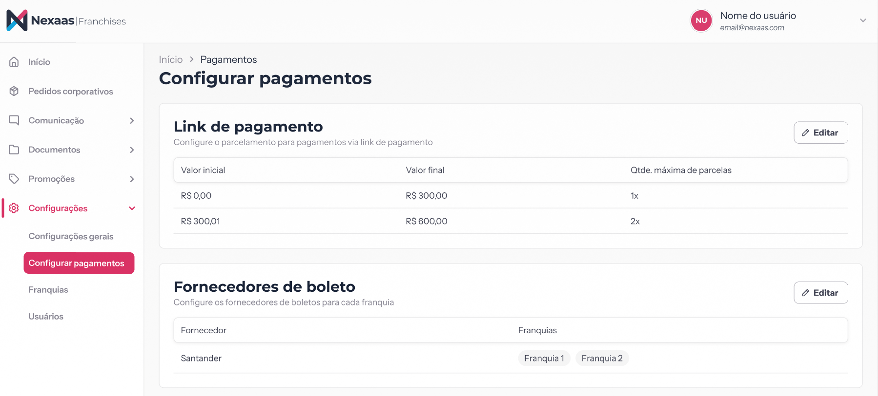 Ao acessar a página, você visualizará dois blocos principais que permitem personalizar a experiência financeira das franquias: