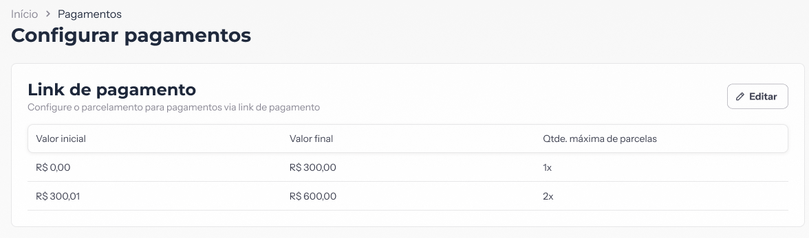 - Link de pagamento: onde são definidas as regras de parcelamento por faixa de valor.
