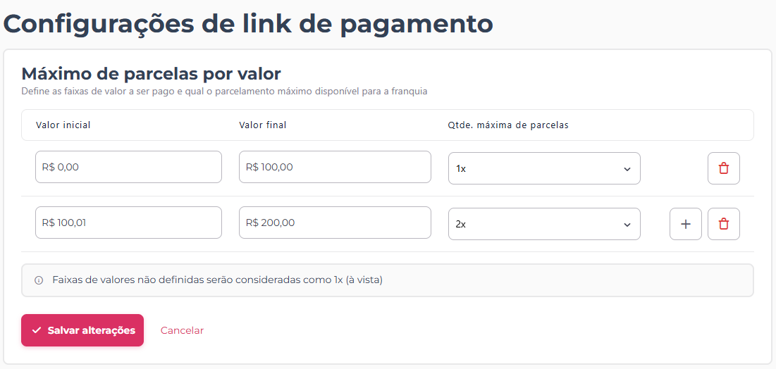Esta seção permite definir o parcelamento máximo disponível para os clientes, onde cada linha representa uma faixa de valor e a quantidade máxima de parcelas: