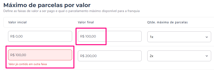 - Qtde. máxima de parcelas: define o limite de parcelamento para a faixa de valor configurada, entre 1x até 12x;