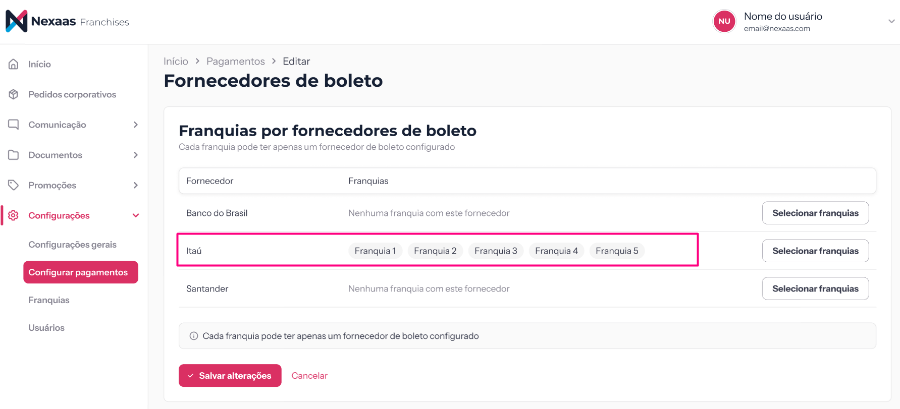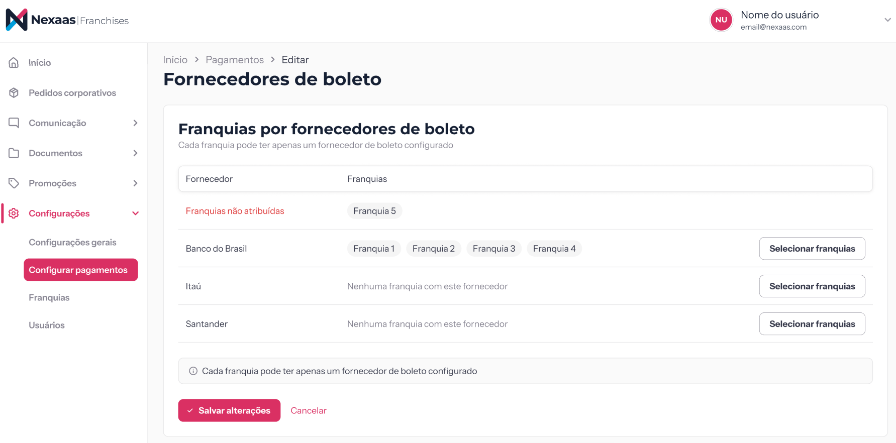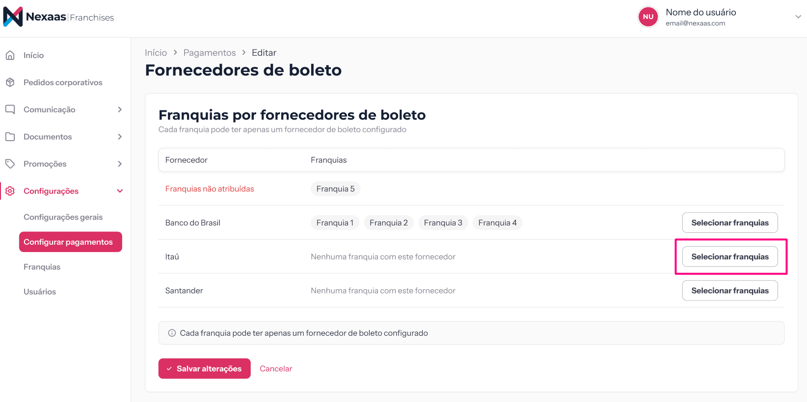 ⚠️ Importante: cada franquia pode estar vinculada a apenas um fornecedor de boleto por vez. Por isso, ao selecionar uma franquia que já possui um banco configurado, o sistema a transferirá automaticamente para o novo fornecedor escolhido.