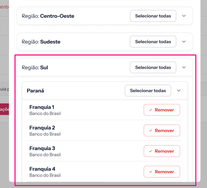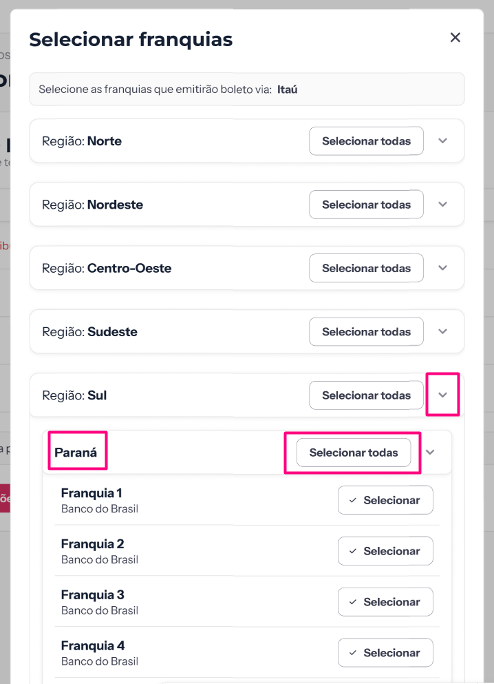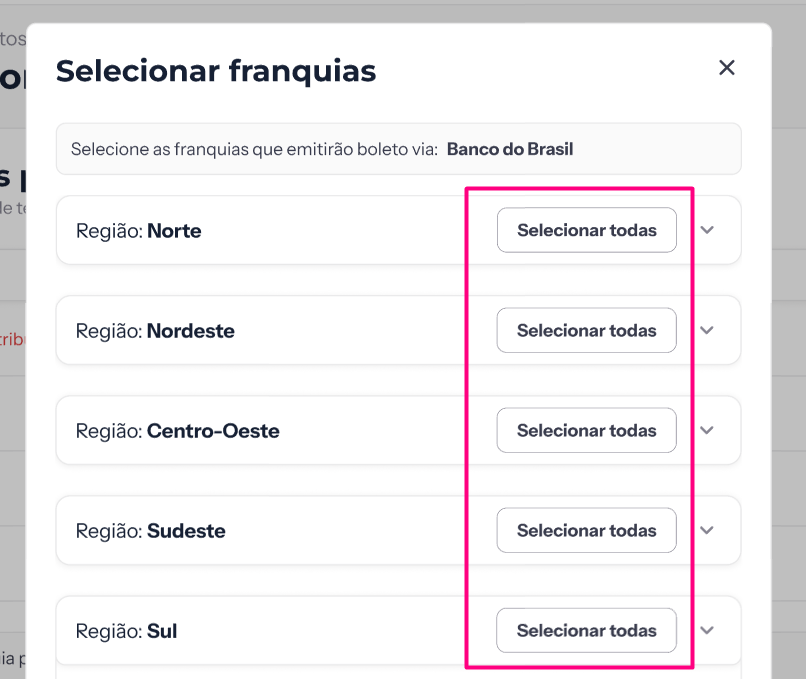 - Seleção em lote: use a opção Selecionar todas em uma região específica para agilizar o processo caso todas as franquias daquela área utilizem o mesmo banco: