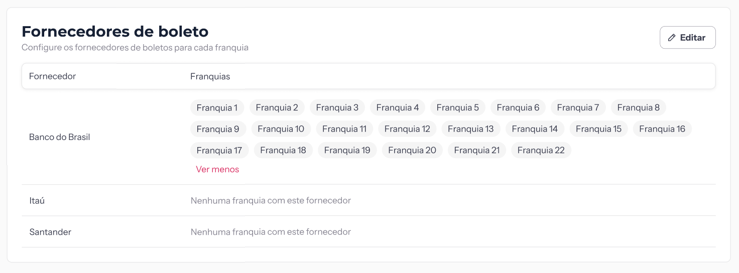 - Fornecedores de boleto: onde você gerencia quais bancos estão vinculados a cada franquia. Os bancos serão cadastrados pelo nosso suporte técnico após solicitação e homologação bancária concluída.