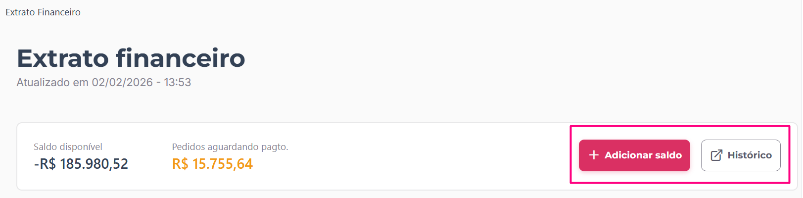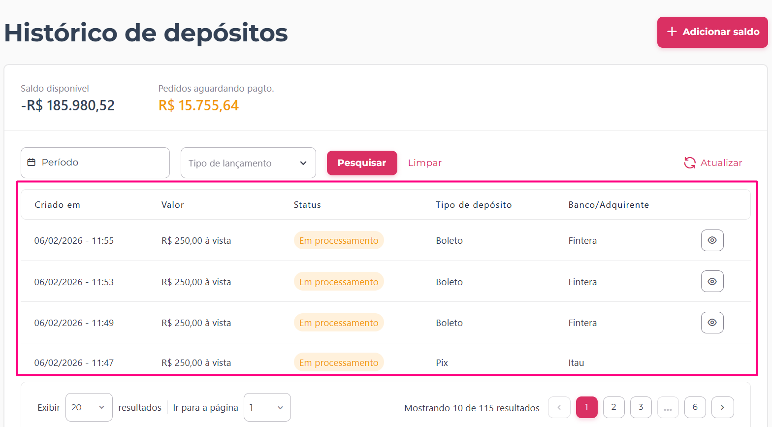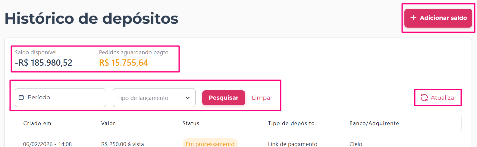 - Saldos e pendências: no topo da página, você visualiza rapidamente seu Saldo disponível atual e o valor total de Pedidos aguardando pagto., que representa os depósitos iniciados que ainda não foram confirmados pelo banco.
