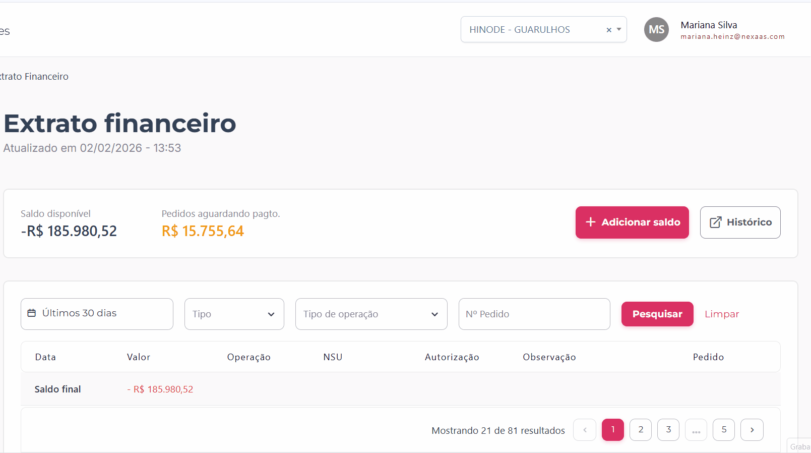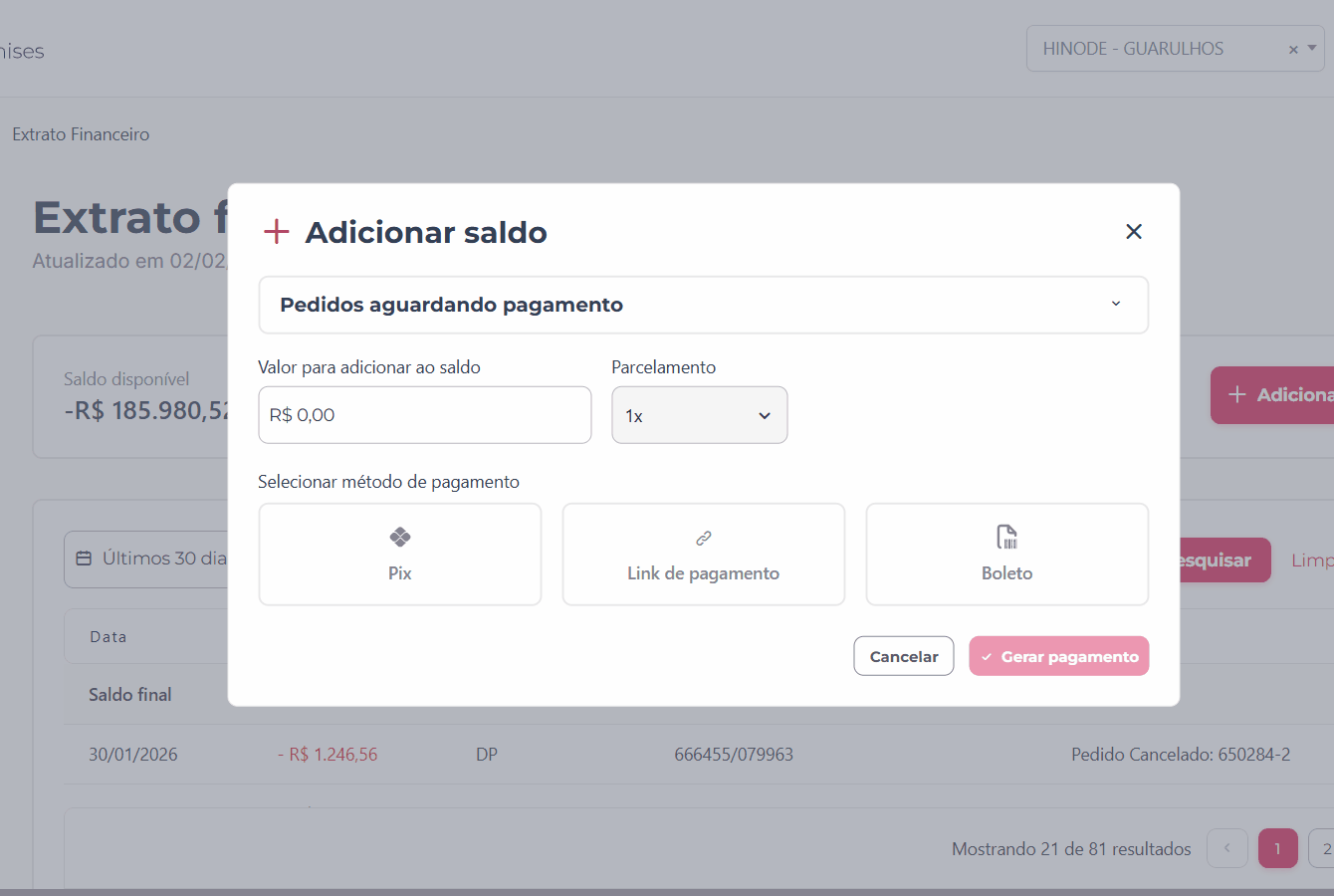 Ter o saldo atualizado da sua franquia é essencial para um dia a dia sem interrupções. Através do menu Extrato Financeiro, você tem a liberdade de adicionar saldo com agilidade e rastreabilidade, e identificar pendências de pagamento de pedidos.