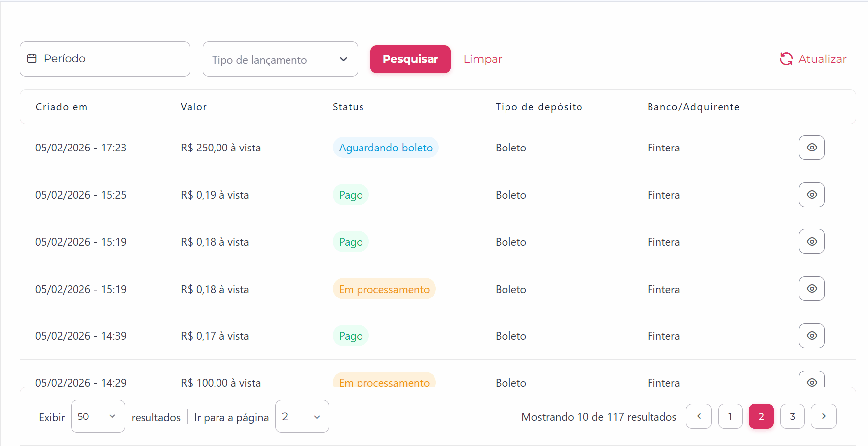 💡 Dica: se o status demorar a mudar após o pagamento, clique no link Atualizar no canto superior da tabela para sincronizar as informações mais recentes do banco.