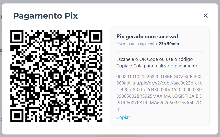 Pix: para compensação instantânea através de QR Code ou chave copia e cola: