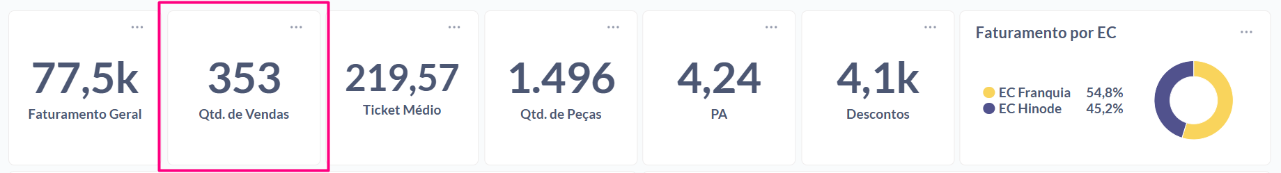 - Para que serve: esse número mede a movimentação da sua franquia. Ele indica se os consultores estão frequentando o seu espaço e se o fluxo de atendimento está alto. Se o faturamento caiu mas a Qtd. de Vendas continua alta, significa que as pessoas estão comprando, mas levando produtos mais baratos.