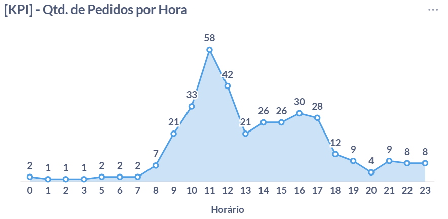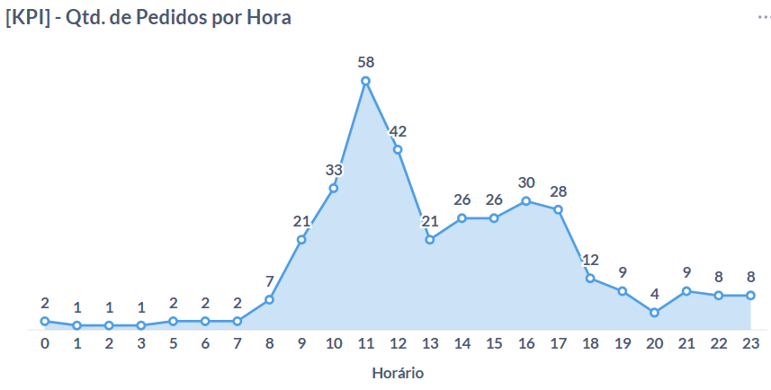 💡 Dica: note que após as 18h o movimento cai drasticamente (de 28 para 12 pedidos). Se você mantém a franquia aberta até tarde, avalie se o custo de energia e pessoal compensa esse volume, ou se vale mais a pena investir em ações de vendas no horário de pico das 11h às 12h.