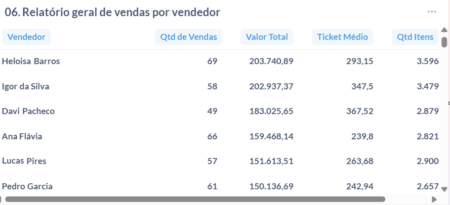 - O que é: tabela que mostra o desempenho individual de cada pessoa da sua equipe, quem são os talentos que estão fazendo o negócio girar. Ela traz o valor total vendido, a quantidade de itens e o ticket médio (o valor médio de cada venda).