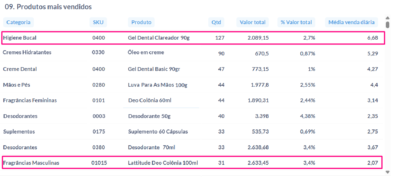 - O que é: uma lista detalhada que mostra quais produtos tiveram a maior saída: ela mostra exatamente o que os seus consultores e clientes estão buscando no dia a dia.