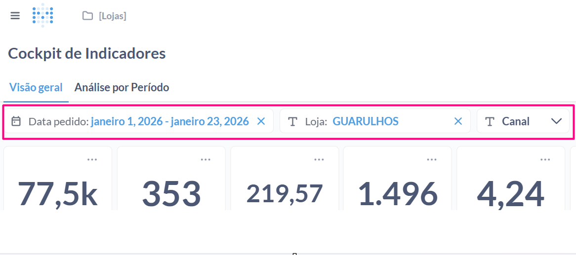 Pense neles como a "lente" da sua análise: ao selecionar o período, a loja e o canal, todos os números e gráficos se atualizam automaticamente para refletir a sua escolha: