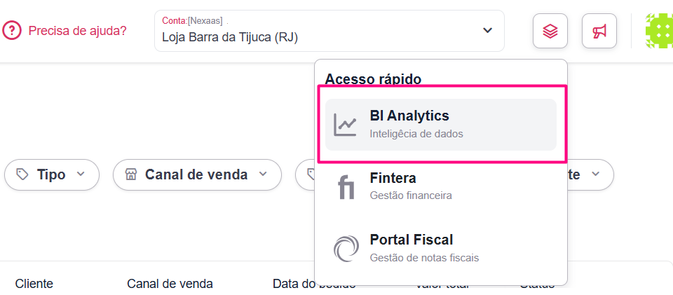 💡 Dica: no Nexaas OMS, você acessa seus relatórios e indicadores rapidamente. Basta clicar no ícone de grade (menu de módulos) no canto superior direito e selecionar BI Analytics: