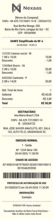 • Envio automático: os dados (CNPJ e informações cadastrais) são enviados diretamente para a nota. O comprovante impresso seguirá o modelo de DANFE Simplificado da NF-e: