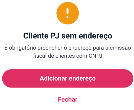 • Atenção ao endereço: caso o cadastro do cliente PJ não possua endereço, será exibido um alerta informando que o cadastro precisa ser atualizado antes de seguir com a venda. Clicando em Adicionar endereço, você será redirecionado para a tela de edição do cadastro do cliente: