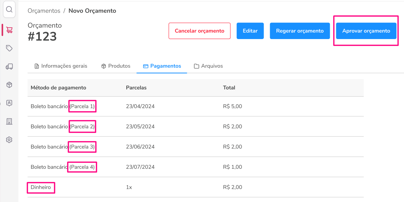 Pronto! Agora é só conferir o resumo das formas de pagamento escolhidas na aba Pagamentos. Para prosseguir, confira sobre o botão Aprovar orçamento no passo 5 deste artigo: