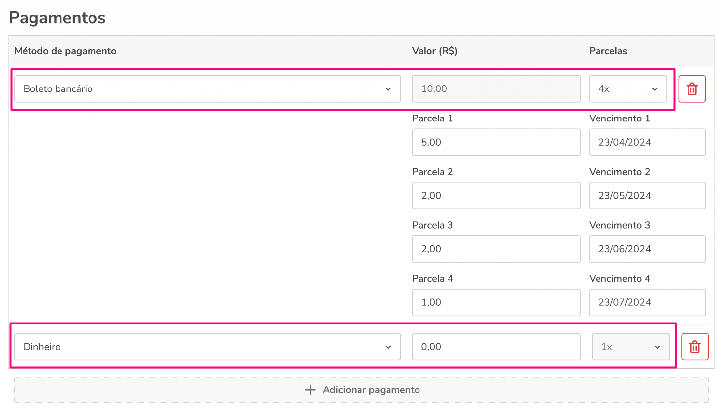 Combinação de métodos: você pode dividir o pagamento entre boleto parcelado e outro método (como dinheiro) no mesmo orçamento.