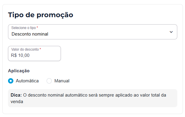 Isso significa que ao configurar um desconto nominal (um valor fixo de desconto, como R$ 10,00), e a opção de aplicação estiver definida como Automática, esse desconto será aplicado diretamente sobre o valor total da compra do cliente, e não especificamente sobre o preço de um item individual.