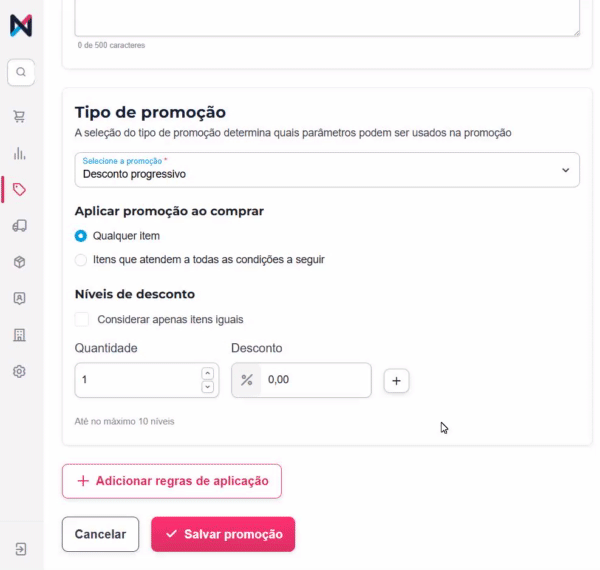 💡 Dica: clique no botão + Adicionar regras de aplicação para adicionar regras específicas para esta promoção. Para saber mais, acesse o artigo de ajuda Regras de Aplicação em Promoções: conheça as opções.